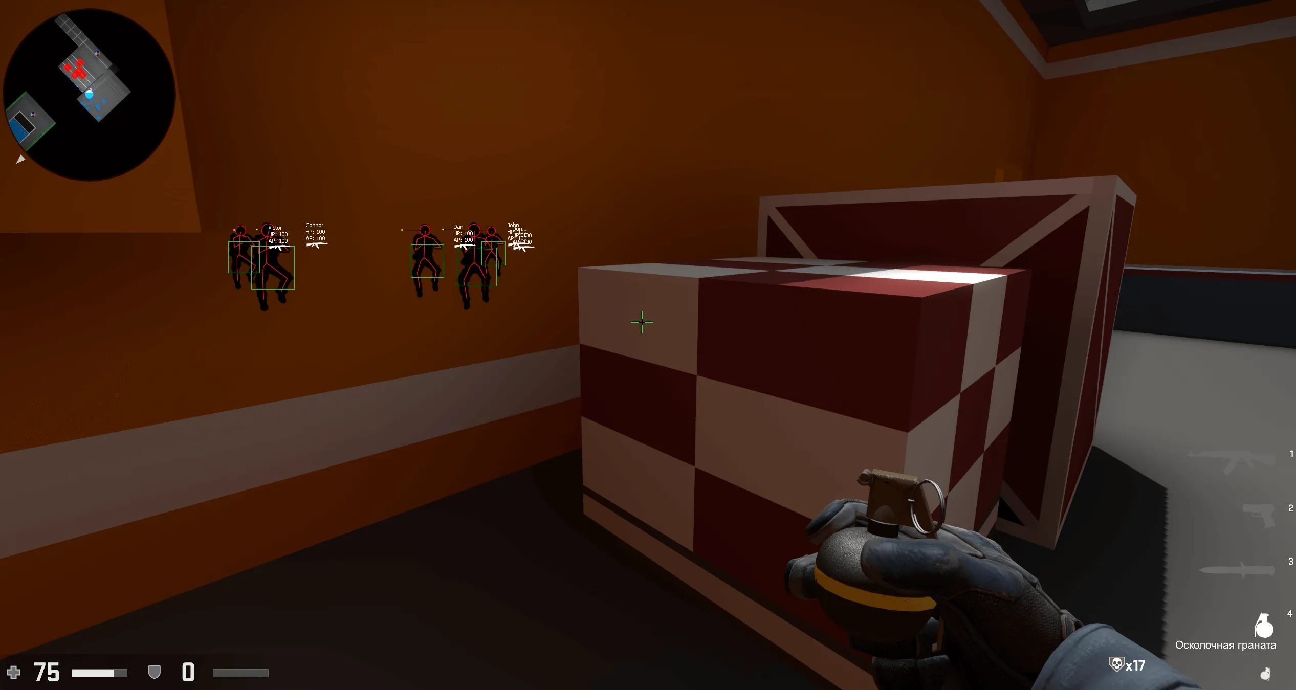 The built-in Wallhack provided basic visual information about opponents. Key data such as health, armor, nickname, and enemy position were displayed. This improved orientation on the map and allowed preemptive responses to threats.